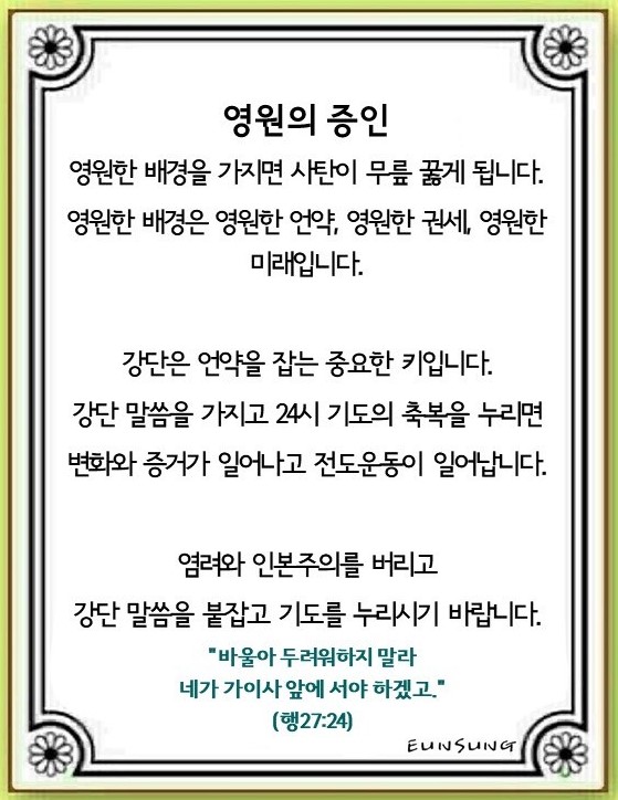 모든 흑암 세력과 세상이 하나님의 권능 앞에 무릎을 꿇게 될 것입니다. 이것이 바로 25시를 넘어선 ‘영원’입니다. 나는 영원의 증인이 될 것입니다. 그렇다면 지금 보고 누려야 할 것은 무엇일까요?