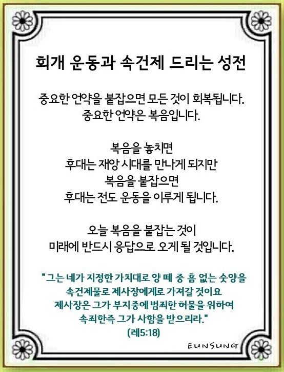 주의 일을 하다가도 잘못하면 언약을 놓칩니다. 응답이 오면 또 복음을 놓치고, 큰 축복이 나타나면 이익, 손해를 따지다가 빛의 경제를 놓칠 수 있습니다. 그러므로 하나님 앞에서 속건제를 드려 해결하라는 것입니다. 오늘 하나님의 언약을 바로 잡으면 반드시 응답이 오게 될 것입니다.