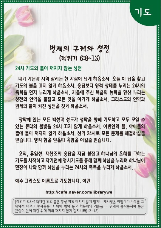 영적 힘을 얻어야 흑암을 이기는 역사가 일어납니다. 오직, 유일성, 재창조의 응답을 지금 붙잡고 오늘부터 하나님의 은혜를 구하는 기도를 시작해야 합니다. 자기 전에는 정시 기도를 누리다 보면 모든 현장에 하나님이 함께 하심을 보는 눈이 열리게 될 것입니다. 그것이 바로 24시입니다.