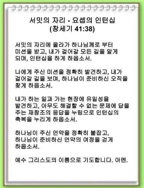 요셉은 갑자기 감옥에 가게 되었지만 감옥에서 총무가 되고, 그 속에서 장관의 꿈을 해석했습니다. 유일성을 발견한 것입니다. 그리고 왕 앞에 서서 아무도 해결할 수 없는 문제에 답을 주는 재창조의 응답을 누렸습니다. 이것이 내가 누릴 인턴십의 축복입니다.