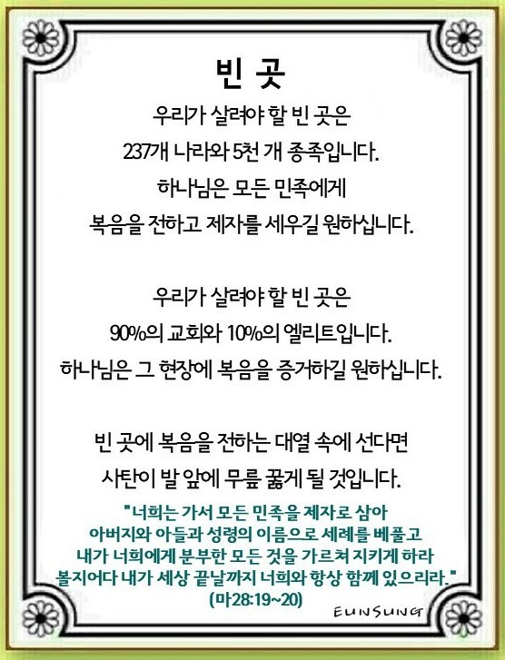 하나님이 복음으로 전 세계 237개 나라를 살릴 세계복음화의 약속을 주셨습니다. 그럼에도 불구하고 전 세계에는 아직 복음을 듣지 못한 빈 곳이 많습니다. 가야 할 곳은 많은데 당장 내가 할 수 있는 것은 별로 없어 보입니다. 하지만 하나님의 절대 계획은 하나님의 방법대로 반드시 성취됩니다. 믿음의 사람이 하나님의 능력을 통해 빈 곳을 찾아가는 것입니다. 과연 빈 곳은 어디일까요?