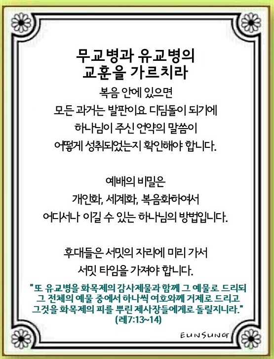 [언약 기도] 하나님의 언약을 잡고 하나님 능력의 역사를 보게 하옵소서. 마음, 생각, 영혼이 하나님이 원하시는 곳에 있게 하옵소서. 예수 그리스도 이름으로 기도합니다. 아멘