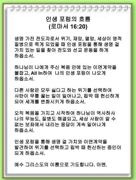 [언약 기도] 인생 포럼을 통해 생명 걸 가치와 이면계약을 발견하여 위기를 선택하고 핍박 때 헌신하는 증인이 되게 하옵소서. 예수 그리스도 이름으로 기도합니다. 아멘
