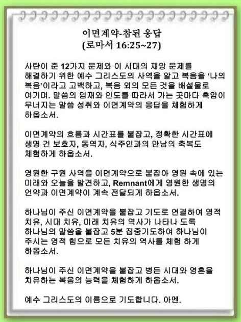 하나님이 주신 이면계약을 붙잡고 기도로 연결할 때 영적 치유, 시대 치유, 미래 치유의 역사가 나타납니다. 하나님의 말씀을 붙잡고 기도로 5분만 집중해도 됩니다. 하나님이 주시는 영적 힘으로 모든 치유의 역사를 체험하게 될 것입니다.