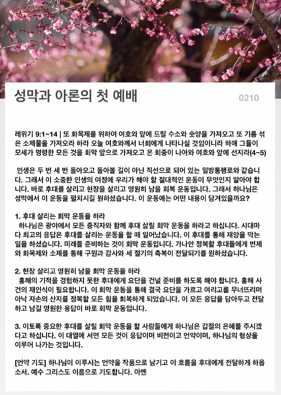 | 광야의 성막 교회에 명하신 것(레위기 8:1~13)- 기도수첩 (0) | 2021.02.09 |