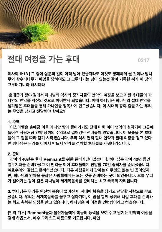 | Remnant의 미션과 영적 서밋(여호수아 1:1~9)-기도수첩 (0) | 2021.02.13 |
