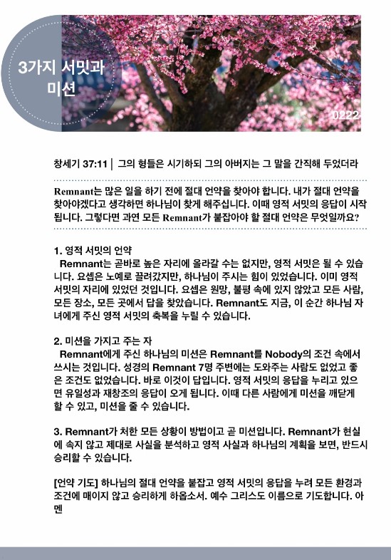 Remnant는 많은 일을 하기 전에 절대 언약을 찾아야 합니다. 내가 절대 언약을 찾아야겠다고 생각하면 하나님이 찾게 해주십니다. 이때 영적 서밋의 응답이 시작됩니다. 그렇다면 과연 모든 Remnant가 붙잡아야 할 절대 언약은 무엇일까요?