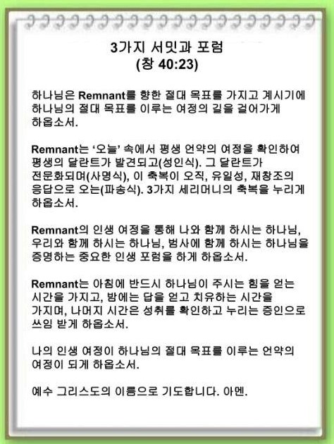 Remnant는 아침에 반드시 하나님이 주시는 힘을 얻는 시간을 가져야 합니다. 밤에는 답을 얻고 치유하는 시간을 가져야 합니다. 나머지 시간은 성취를 확인하고 누리는 것입니다. 결국 Remnant를 증인으로 사용하실 것입니다.