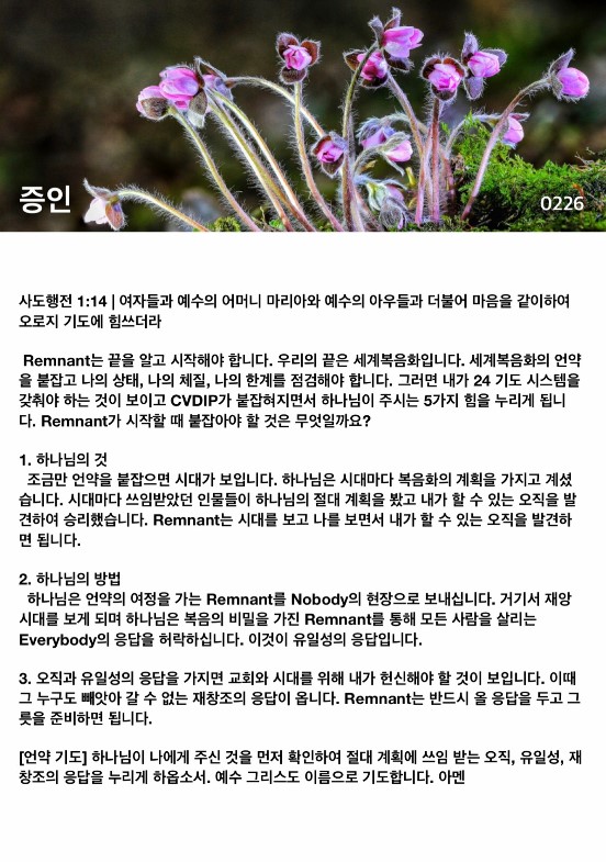 Remnant는 끝을 알고 시작해야 합니다. 우리의 끝은 세계복음화입니다. 세계복음화의 언약을 붙잡고 나의 상태, 나의 체질, 나의 한계를 점검해야 합니다. 그러면 내가 24 기도 시스템을 갖춰야 하는 것이 보이고 CVDIP가 붙잡혀지면서 하나님이 주시는 5가지 힘을 누리게 됩니다. Remnant가 시작할 때 붙잡아야 할 것은 무엇일까요?