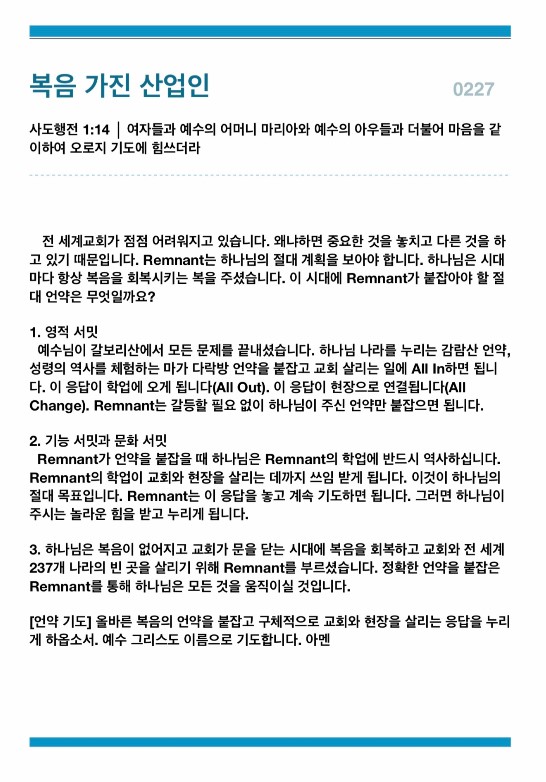 복음 가진 산업인(사도행전 1:14)