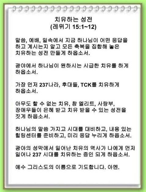 [언약 기도] 광야의 성막에서 일어난 치유의 역사가 나에게 먼저 일어나 237 시대를 치유하는 증인 되게 하옵소서. 예수 그리스도 이름으로 기도합니다. 아멘
