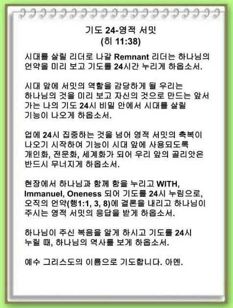 이 시대를 살아가는 Remnant 리더의 조건 중 첫 번째는 기도를 24시간 누리는 것입니다. 성경의 Remnant 7명(요셉, 모세, 사무엘, 다윗, 엘리사, 이사야, 바울)은 하나님의 언약을 미리 보고 기도를 24시 누렸습니다. 이 힘을 가지고 시대를 살릴 리더로 나갈 우리는 어떻게 기도를 24시 누릴 수 있을까요?
