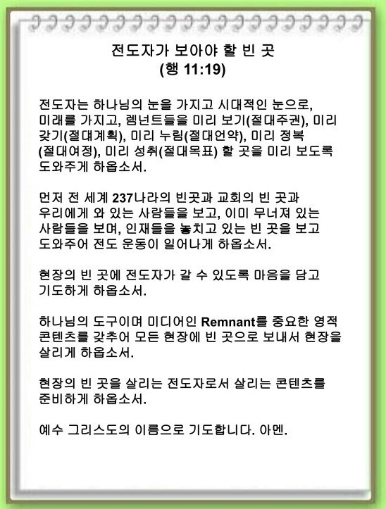 [언약 기도] 현장의 빈 곳을 살리는 전도자로서 살리는 콘텐츠를 준비하게 하옵소서. 예수 그리스도 이름으로 기도합니다. 아멘