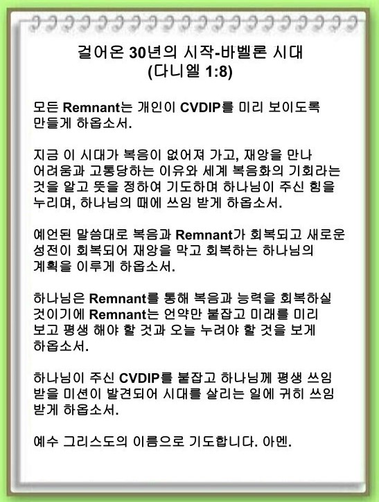 모든 Remnant는 개인의 CVDIP를 만들어야 합니다. 조금 틀리더라도 괜찮습니다. 하나님이 수정해 주시기 때문입니다. CVDIP를 가진 Remnant는 하나님이 주신 언약을 하나님이 이루어 나가심을 볼 수 있기에 당황하지 않습니다. 바벨론에 있던 Remnant들이 이 CVDIP를 가지고 있었습니다. 이들은 무엇을 가지고 있었을까요?
