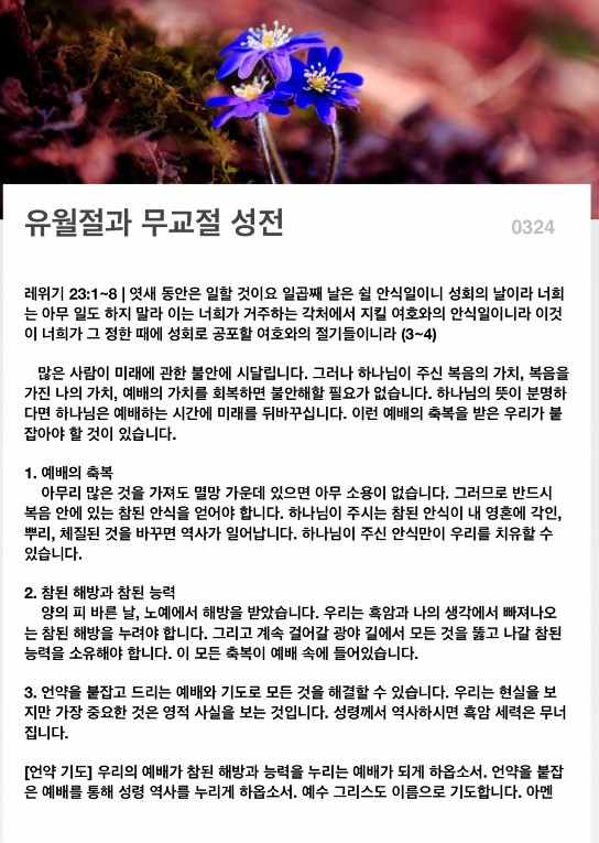| 오순절 성전(레위기 23:15~22)-기도수첩 (0) | 2021.03.25 |