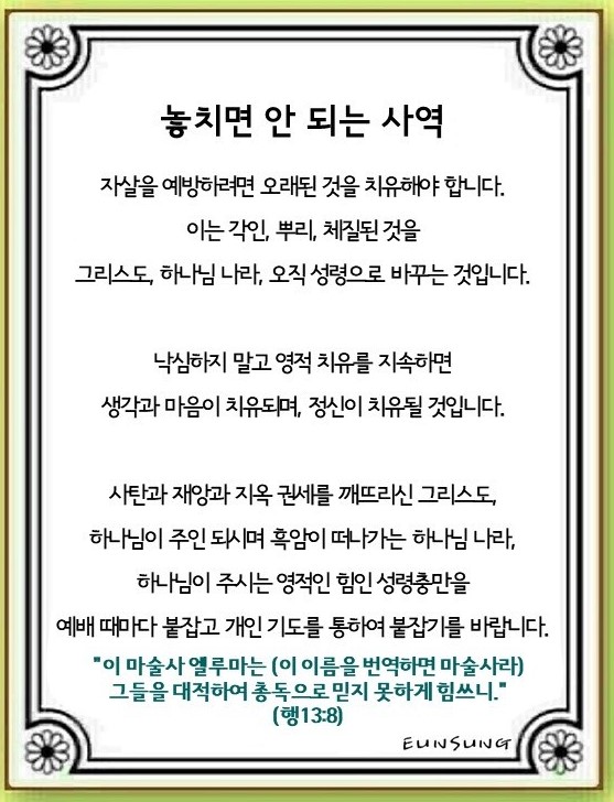 자살한 사람들의 특징은 ‘조급’입니다. 이들의 영적 문제는 오래된 것입니다. 교회에 다니다가 아픈 것이 아니라, 이미 아픈 상태였습니다. 이 사실을 알면 더 정확한 치유를 할 수 있습니다. 그들에게 각인된 것, 뿌리내린 것, 체질된 것을 그리스도, 하나님 나라, 오직 성령으로 바꾸면 됩니다(행1:1, 3, 8).