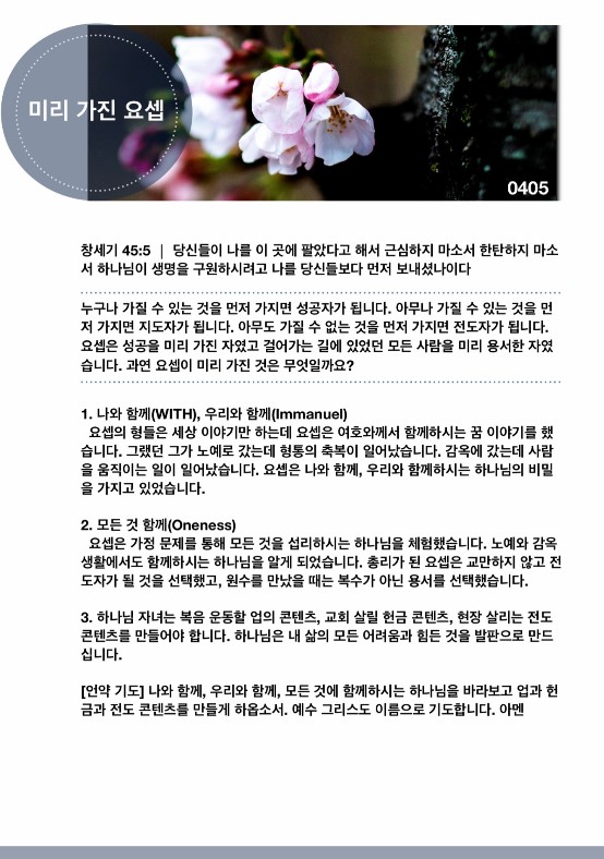 누구나 가질 수 있는 것을 먼저 가지면 성공자가 됩니다. 아무나 가질 수 있는 것을 먼저 가지면 지도자가 됩니다. 아무도 가질 수 없는 것을 먼저 가지면 전도자가 됩니다. 요셉은 성공을 미리 가진 자였고 걸어가는 길에 있었던 모든 사람을 미리 용서한 자였습니다. 과연 요셉이 미리 가진 것은 무엇일까요?