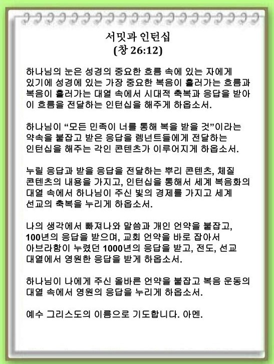 [언약 기도] 하나님이 나에게 주신 올바른 언약을 붙잡고 복음 운동의 대열 속에서 영원의 응답을 누리게 하옵소서. 예수 그리스도 이름으로 기도합니다. 아멘