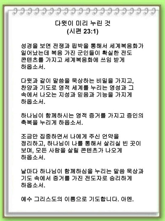 [언약 기도] 날마다 하나님이 함께하심을 누리는 말씀 묵상과 기도 속에서 증거를 가진 전도자로 승리하게 하옵소서. 예수 그리스도 이름으로 기도합니다. 아멘