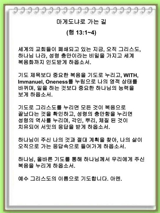 마게도냐로 가는 길은 기도를 바르게 누리는 것에서 시작됩니다. 하나님이 주신 나의 것과 절대 계획을 찾아, 우리의 삶이 오직으로 가는 응답 속으로 들어가야 하겠습니다.