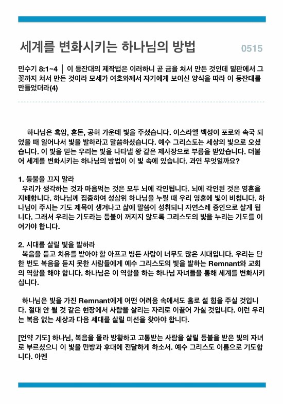 세계를 변화시키는 하나님의 방법(민수기 8:1~4)