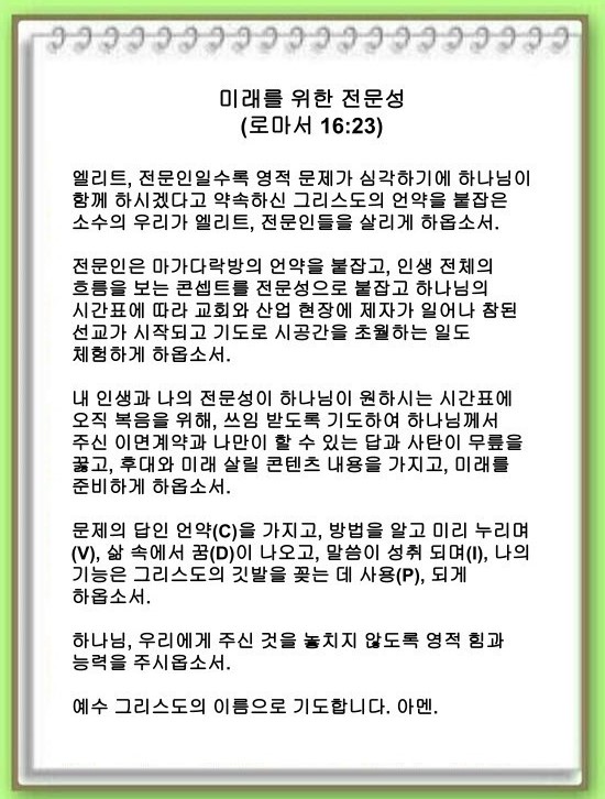 우리의 전문성이 오직 복음을 위해, 하나님의 시간표에 맞게 쓰임 받길 기도해야 합니다. 하나님께서 주신 이면계약을 보아야 합니다(롬16:1~23). 동시에 복음 안에서 더 겸손해지면 나만이 할 수 있는 답이 나옵니다. 그러면 사탄이 무릎을 꿇게 되고 영세 전에 감추어진 시간표가 보입니다. 이것이 우리의 내용이 될 것입니다.