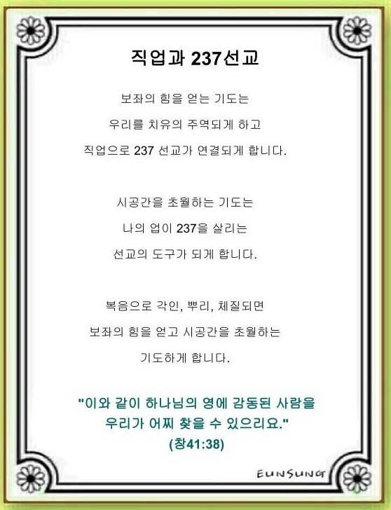 치유의 비밀과 능력을 가진 사람들을 통해 전 세계 237개 나라가 살아났습니다. 몇 사람이 애굽이 치유되자 이 응답이 237로 퍼져갔습니다. 다니엘과 포로들은 바벨론을 치유하고 성전재건의 주춧돌을 놓았습니다. 바울과 그 팀은 사탄에게 완전히 장악된 로마를 치유하고 살렸습니다. 우리의 기도는 시공간을 초월하여 역사합니다. 언약을 잡고 깊은 기도 속으로 들어가면 됩니다. 그 결과로 나의 업은 237을 살리는 선교의 도구가 될 것입니다.