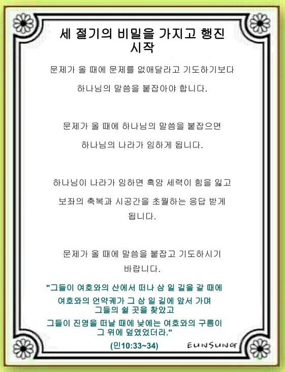 세 절기의 비밀을 가지고 행진 시작(민수기 10:33~36)