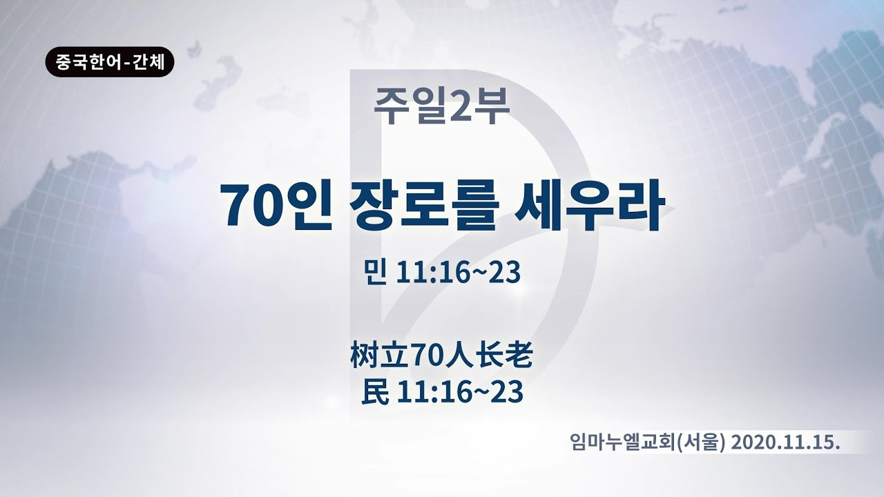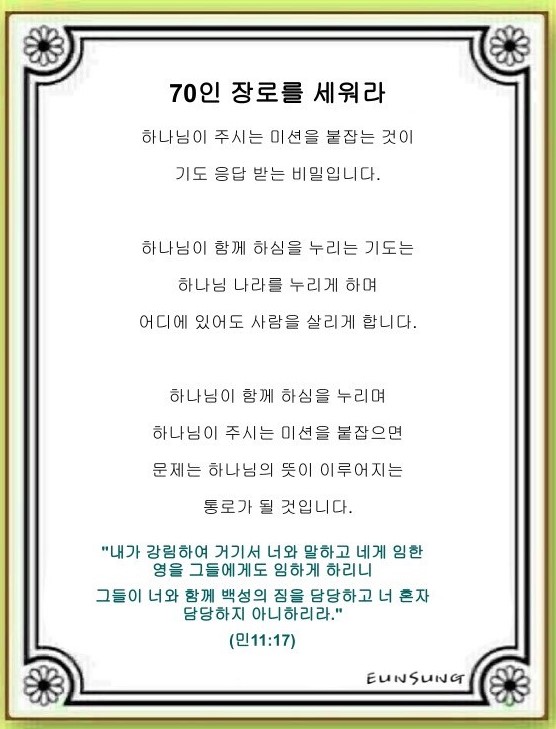 하루가 멀다고 일과 사람 관계, 가정 문제 등 예상하지 못한 어려움이 닥쳐옵니다. 경제적 어려움을 겪고 실패했다는 생각에 마음의 병은 더 깊어집니다. 이런 절망의 상태에 있다면 하나님께서 준비하신 것을 볼 기회입니다. 모세와 함께 이 기회를 본 사람들이 70인 장로들이었습니다. 하나님이 그들과 같이 우리에게 준비하신 것은 무엇일까요?