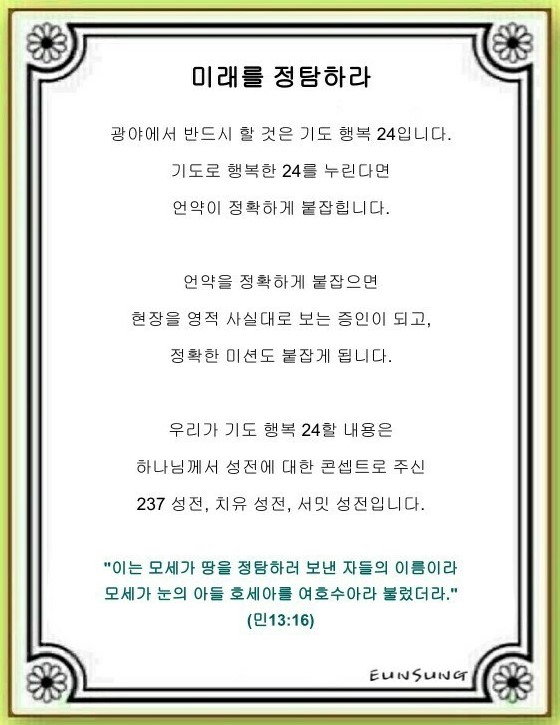 기도로 행복한 24를 누린다면 언약이 정확하게 붙잡힙니다. 여호수아와 갈렙은 “여호와께서 모세에게 일러 가라사대”, “모세가 여호와의 명을 좇아”와 같은 말씀을 언약으로 굳게 붙잡았습니다. 말씀을 볼 때는 12가지 문제의 배경, 영적 사실의 흐름, 미래 방향을 참고해야 합니다.