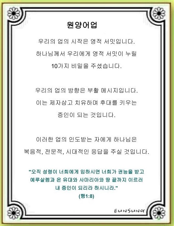 현장에서 10가지 비밀을 누리고, 우리 업을 말씀 안에서 발견하고 인도받는다면 하나님께서 복음적, 전문적, 시대적인 응답을 주십니다. 반드시 말씀은 성취되고 현장은 정복됩니다.
