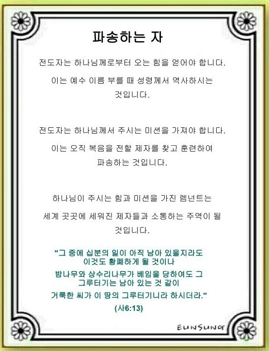 전도와 선교 혹은 세계복음화라는 크고도 멀게 느껴지는 단어가 아니라 당장 내 눈앞에 닥친 오늘 내게 맡겨진 일은 어떤 것이 있을까.