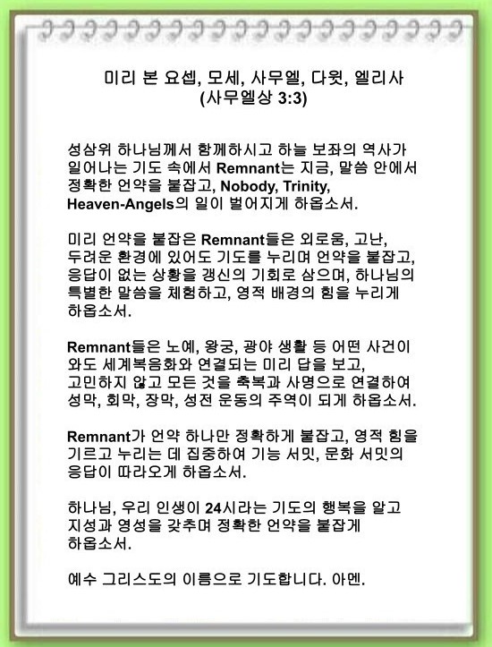 우리가 기도할 때 성삼위 하나님께서 함께하시고 하늘 보좌의 역사가 일어납니다. 이런 기도 속에서 Remnant가 정확한 언약을 붙잡으면, 하나님께서는 아무도 할 수 없는 일을 이루어 가십니다. Remnant는 지금, 말씀 안에서 언약을 붙잡아야 합니다.
