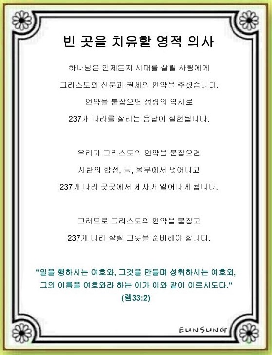 [언약 기도] 하나님, 우리에게 전 세계 237개 나라를 치유하고 움직일 보좌의 응답을 받을 참된 기도가 시작되게 하옵소서. 예수 그리스도 이름으로 기도합니다. 아멘