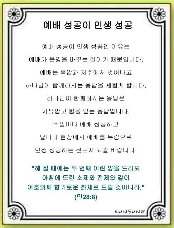 예배의 축복을 가장 잘 누린 민족이 유대인입니다. 유대인은 주야를 가리지 않고 예배와 헌금을 드렸습니다. 우리도 각자 현장에서 십자가의 비밀을 누리는 예배를 날마다 누리길 기도합니다.