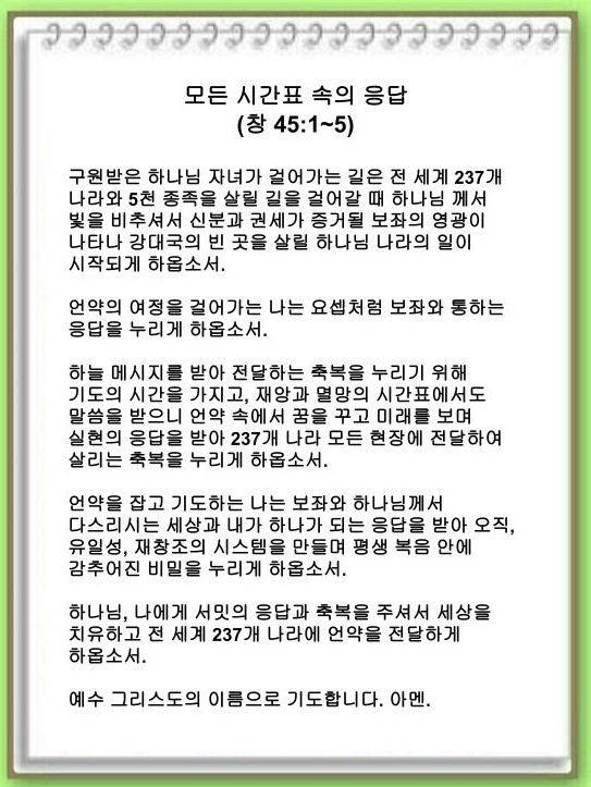하나님 자녀에게는 언제나 하늘의 메시지를 받을 축복이 있습니다. 이것을 누리는 것이 기도의 시간이며 이것을 이정표라고 합니다. 재앙과 멸망의 시간표에서도 말씀을 받으니 언약 속에서 꿈을 꾸고 미래를 보며 실현의 응답을 받는 것입니다. 이 언약과 응답을 전 세계 237개 나라 모든 현장에 전달하여 살리는 축복이 우리의 것입니다. 그 길에 하나님께서는 이 일을 넉넉하게 심부름하도록 능력과 기적을 쏟으실 것입니다.