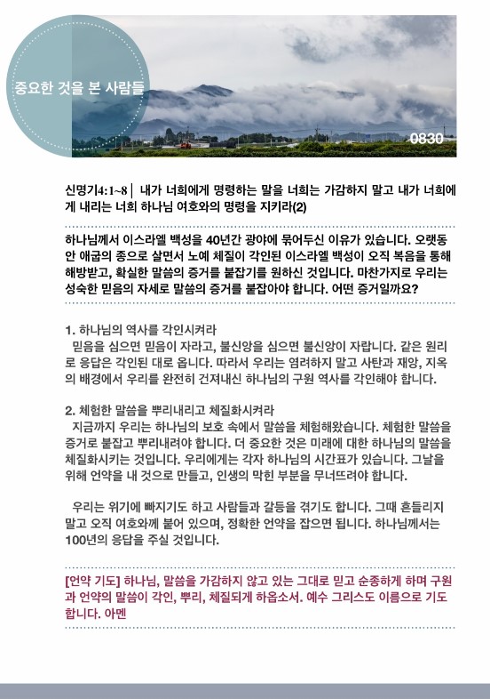 [언약 기도] 하나님, 말씀을 가감하지 않고 있는 그대로 믿고 순종하게 하며 구원과 언약의 말씀이 각인, 뿌리, 체질되게 하옵소서. 예수 그리스도 이름으로 기도합니다. 아멘