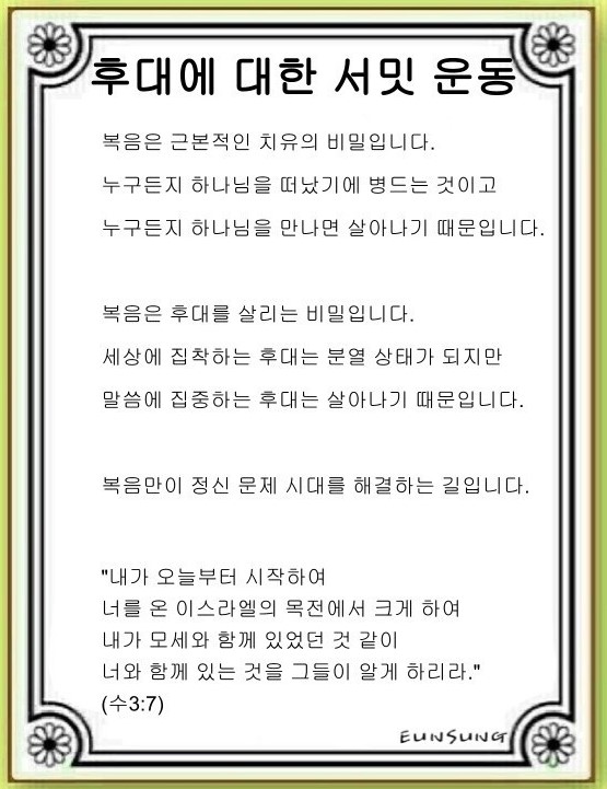 영혼이 살아나는 유일한 방법은 하나님께 집중하는 것입니다. 말씀이 곧 하나님이시기 때문에 하나님의 말씀을 묵상하고 기도하는 것이 바로 하나님과 대면하는 것입니다. 말은 간단해 보이지만, 생각과 마음을 오롯이 하나님께 집중하지 못하는 분열된 상태인 사람이 대부분입니다. 하나님을 향해 마음과 생각과 신체가 Oneness될 때 치유가 일어납니다. 이것이 후대를 살릴 유일한 방법입니다.