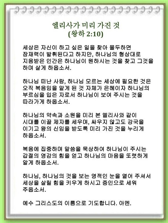 대부분의 사람이 배부르고 넉넉하게 잘 사는 것이나 사람 들의 인정과 사랑받는 것을 갈구하며 살아갑니다. 두 사람 몫의 영감을 구한 엘리사는 하나님이 원하시는 것을 보았습니다. 하나님의 약속과 소원을 미리 본 엘리사를 통해 하나님은 시대를 이끌 제자를 세우시며 싸우지 않고도 강국을 이기고 왕의 신임을 받게 하셨습니다.