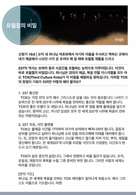 237의 역사는 보좌의 힘과 시공간을 초월하는 능력으로 이루어집니다. 이것이 바로 유월절의 비밀입니다. 하나님은 강대국 애굽, 복음 전할 이스라엘을 모두 아는 TCK(Third Culture Kids)가 이 비밀을 체험하길 원하십니다. 이처럼 TCK의 장점이 기회가 되려면 어떻게 해야 할까요?