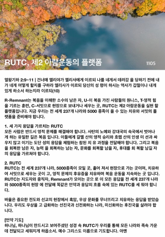 R-Remnant는 복음을 이해한 소수의 남은 자, U-이 복음 가진 사람들의 원니스, T-영적 힘을 기르는 훈련, C-서밋으로 현장으로 보내거나 세우는 곳, RUTC는 제2 아람운동을 실현할 플랫폼입니다. 지금 우리는 전 세계 237개 나라와 5000 종족이 올 수 있는 치유와 서밋의 플랫폼을 준비해야 합니다.
