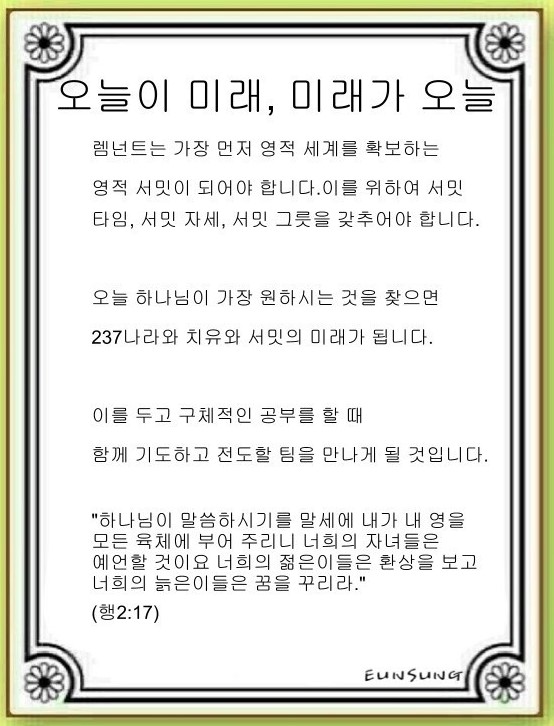 오늘 하나님이 가장 원하시는 것을 찾아야 합니다. 찾았다면 최선을 다해 최고로 가는 것입니다. 잘하든 못하든 오늘의 몫을 누리는 것입니다. 매일의 작은 작품들이 쌓일 때 ‘전 세계 237개 나라, 치유, 서밋’의 미래가 오늘의 응답으로 오게 됩니다.