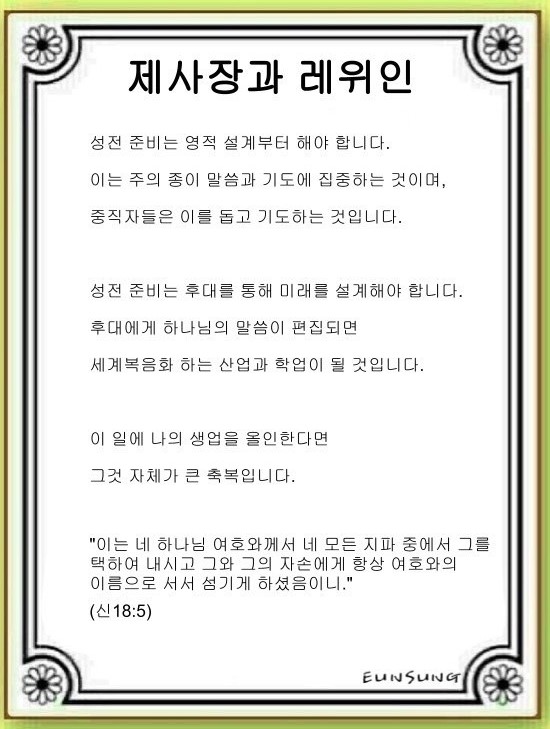 성전을 어떻게 짓느냐에 따라 영적 싸움이 달라집니다. 그런 의미에서 성전은 주의 종(제사장)들이 온전히 24시 집중할 수 있는 곳이어야 합니다. 그곳에는 등불과 향단이 항상 켜져 있고 떡상, 물두멍 등이 준비되어 있어야 합니다. 또 중직자들은 모든 백성이 하나님 말씀을 들을 수 있도록 제사장들을 돕고 기도해야 합니다.