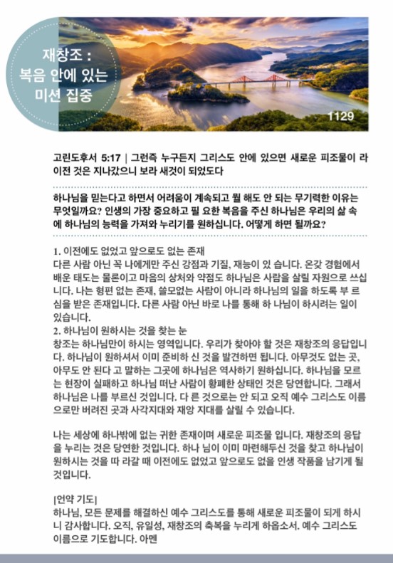 나는 세상에 하나밖에 없는 귀한 존재이며 새로운 피조물입니다. 재창조의 응답을 누리는 것은 당연한 것입니다. 하나님이 이미 마련해두신 것을 찾고 하나님이 원하시는 것을 따라갈 때 이전에도 없었고 앞으로도 없을 인생 작품을 남기게 될 것입니다.