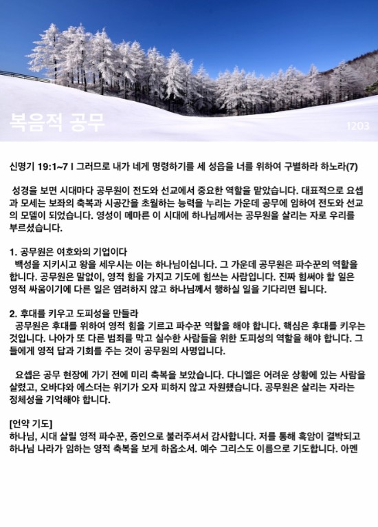 요셉은 공무 현장에 가기 전에 미리 축복을 보았습니다. 다니엘은 어려운 상황에 있는 사람을 살렸고, 오바댜와 에스더는 위기가 오자 피하지 않고 자원했습니다. 공무원은 살리는 자라는 정체성을 기억해야 합니다.