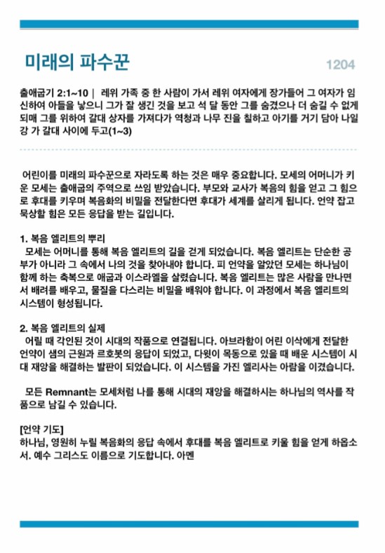 어린이를 미래의 파수꾼으로 자라도록 하는 것은 매우 중요합니다. 모세의 어머니가 키운 모세는 출애굽의 주역으로 쓰임 받았습니다. 부모와 교사가 복음의 힘을 얻고 그 힘으로 후대를 키우며 복음화의 비밀을 전달한다면 후대가 세계를 살리게 됩니다. 언약 잡고 묵상할 힘은 모든 응답을 받는 길입니다.
