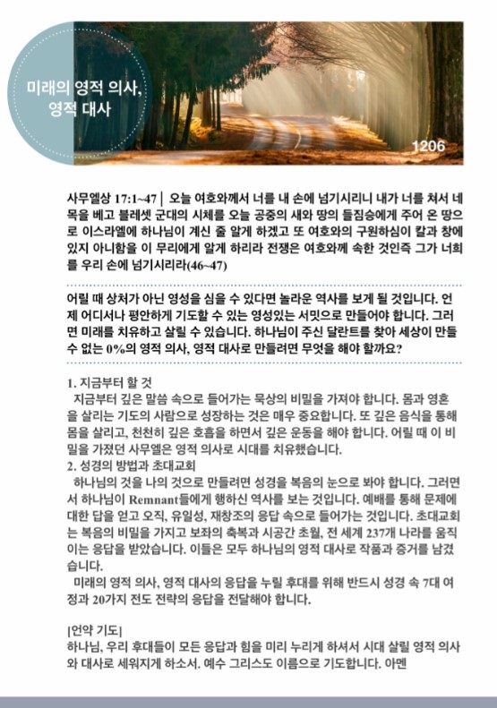 지금부터 깊은 말씀 속으로 들어가는 묵상의 비밀을 가져야 합니다. 몸과 영혼을 살리는 기도의 사람으로 성장하는 것은 매우 중요합니다. 또 깊은 음식을 통해 몸을 살리고, 천천히 깊은 호흡을 하면서 깊은 운동을 해야 합니다. 어릴 때 이 비밀을 가졌던 사무엘은 영적 의사로 시대를 치유했습니다.