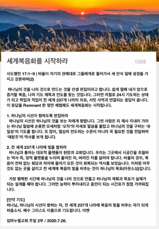 하나님, 하나님의 시선이 향하는 자, 전 세계 237개 나라에 복음의 빛을 비추는 자가 되게 하옵소서. 예수 그리스도 이름으로 기도합니다. 아멘