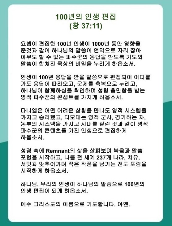 하나님, 우리의 인생이 하나님의 말씀으로 100년의 인생 편집이 되게 하옵소서. 예수 그리스도 이름으로 기도합니다. 아멘