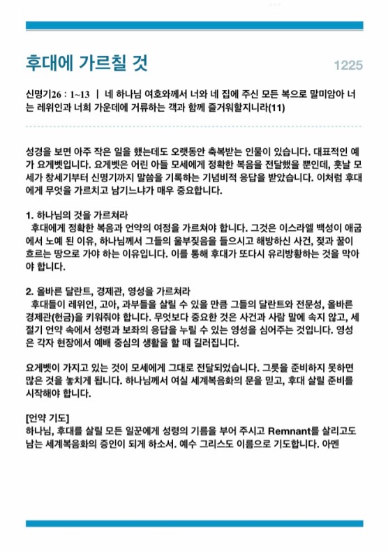후대에게 정확한 복음과 언약의 여정을 가르쳐야 합니다. 그것은 이스라엘 백성이 애굽에서 노예 된 이유, 하나님께서 그들의 울부짖음을 들으시고 해방하신 사건, 젖과 꿀이 흐르는 땅으로 가야 하는 이유입니다. 이를 통해 후대가 또다시 유리방황하는 것을 막아야 합니다.